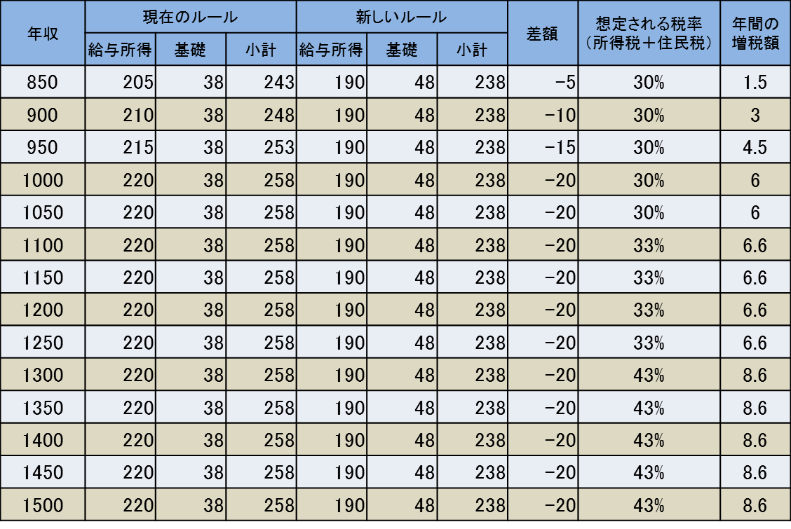 給与所得控除が200万円から190万円に減っても、基礎控除が10万円増えるため、総額は変わりません。
