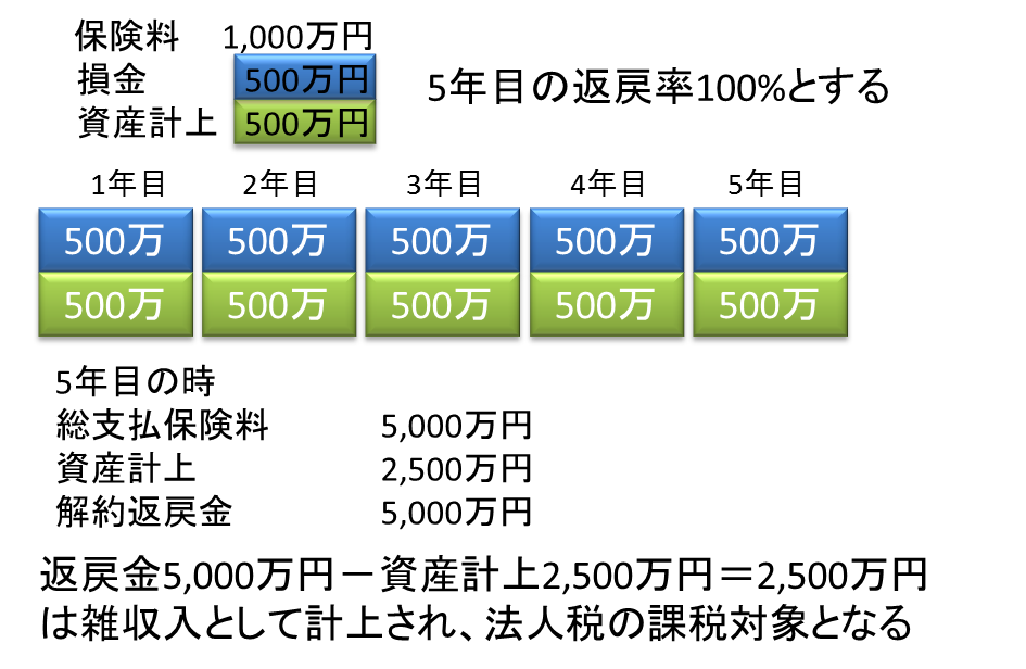 下記の例(1/2損金の逓増定期 5年目に返戻率100%とする)の場合、解約時には資産計上分を除いた部分が「雑収入」となり、法人税が課税されます。