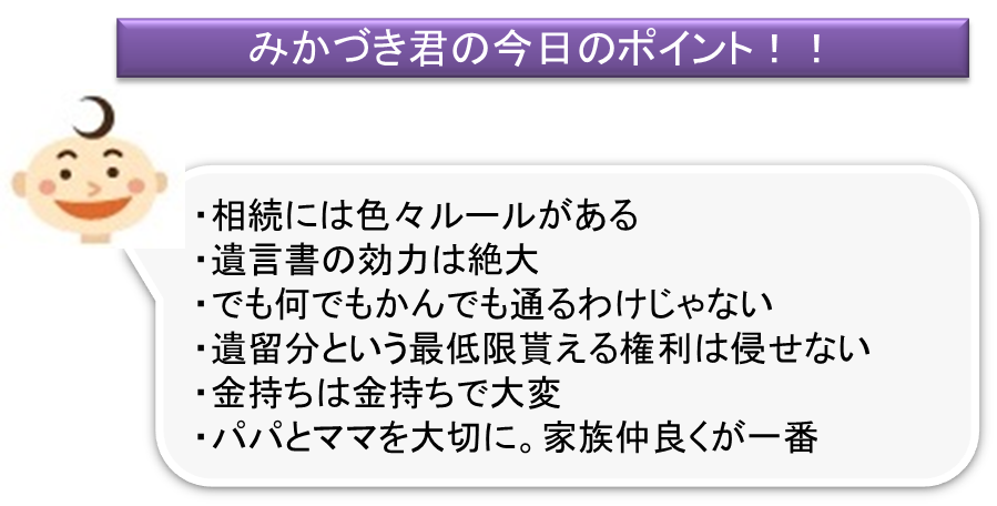 でもね。遺言書っていうのは非常に効力が強くて、何て言ったって財産を残す本人の言葉だからかなり尊重されるんだけど、何でもかんでも書いてある通り、って訳にはいかないんだよ。みかづき君、何でだか分かる?