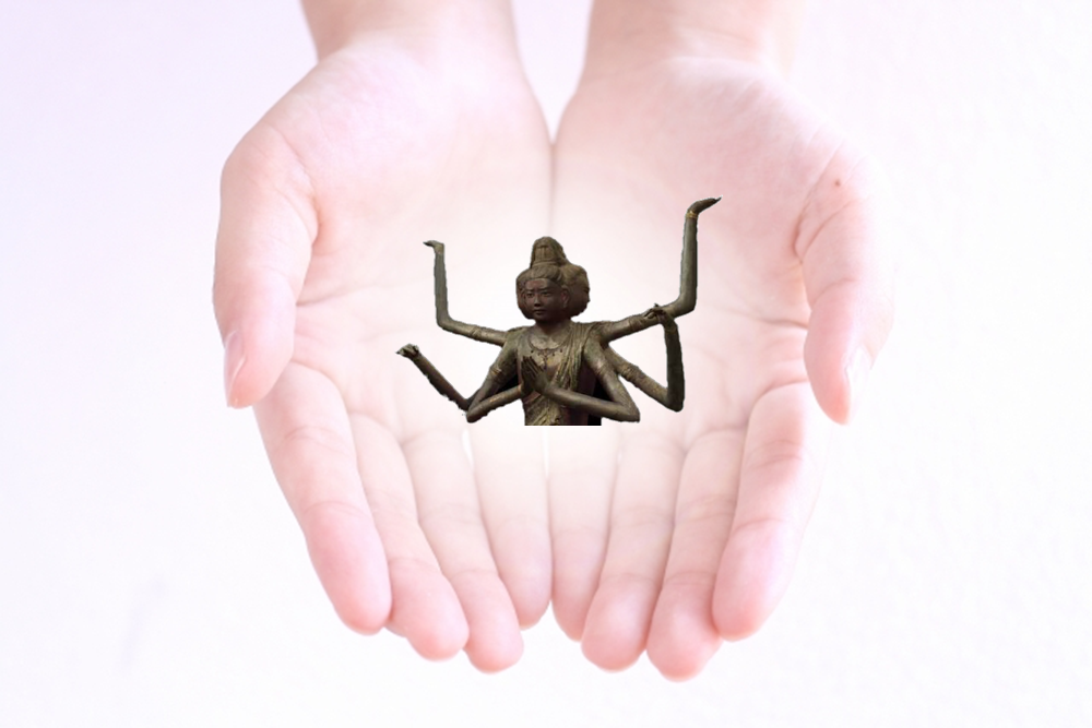 「あらー、それはまた随分とご利益がありそうな。。。。ちなみにサイズはどうでしょうか?手のひら阿修羅だと助かるんですがぁ。。。。」