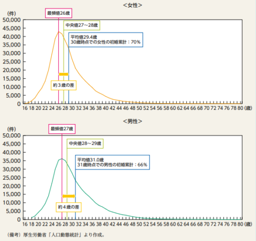 初婚年齢は「平均」にすると女性29.4歳、男性31歳なのだが、最頻値は女性26歳、男性27歳。