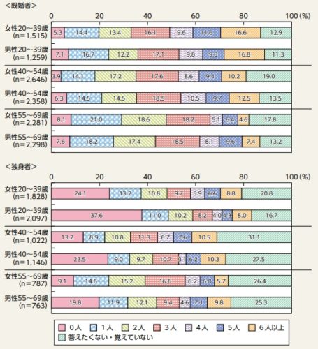 対して、独身者の場合「0人」以外のボリュームゾーンがなく、数字もバラけている。