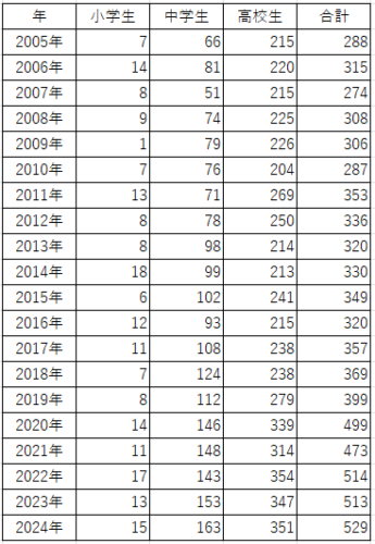 例えば2005年と2024年を比べれば、中学生で66人→163人と2.5倍、高校生は215人→351人と1.6倍になっている。