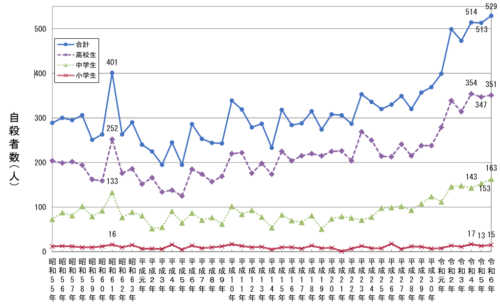 昭和55年(1980年)から令和6年(2024年)までの小中高生の自殺者数の推移で、平成20年代に入ってから右肩上がりに上昇している。