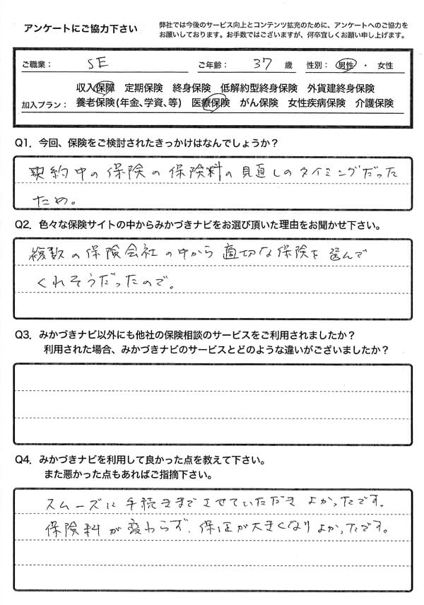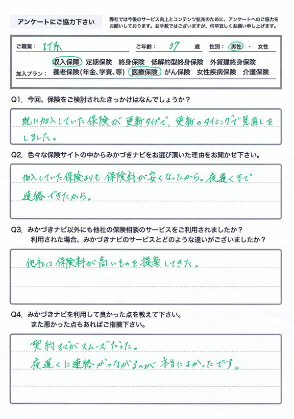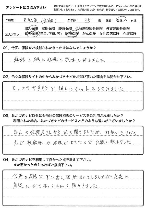 - 営業時間を遅くまでされているので、メール等、連絡を気がねなくできた。平日の仕事が終わった後に気さくに話ができ、説明を受けることができた。保険の種類を決めるまで、自分で時間がかかりましたが、気長に話をききいれて頂き、「自分の求めている保険が何なのか!」を導いて頂いた点、感謝しております。