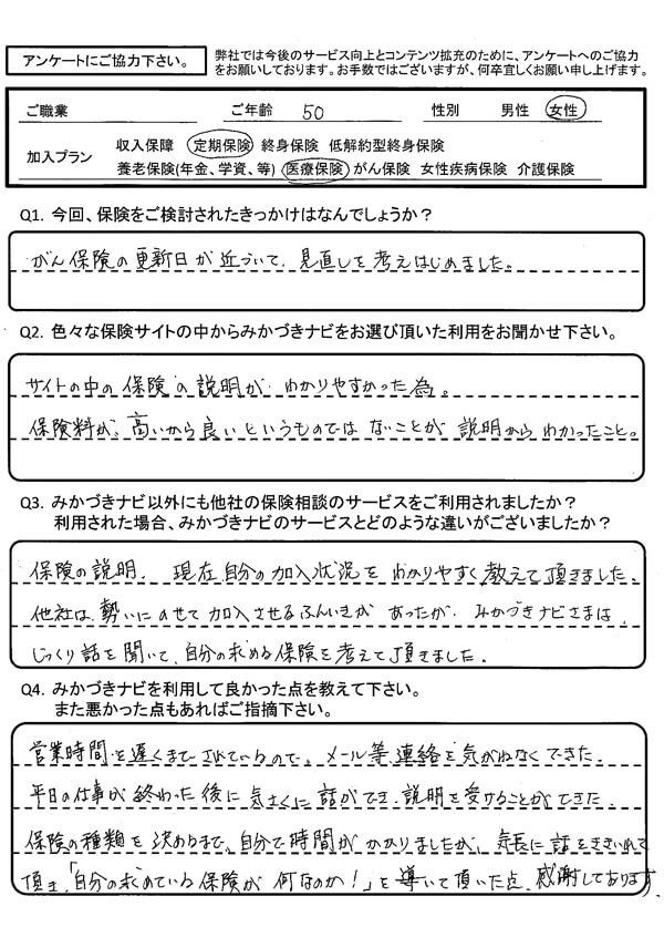 - 保険の説明、現在自分の加入状況をわかりやすく教えて頂きました。他社は勢いにのせて加入させるふんいきがあったのが、みかづきナビさまは、じっくり話を聞いて、自分の求める保険を考えて頂きました。