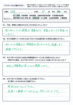 保険の説明、現在自分の加入状況をわかりやすく教えて頂きました。他社は勢いにのせて加入させるふんいきがあったのが、みかづきナビさまは、じっくり話を聞いて、自分の求める保険を考えて頂きました。