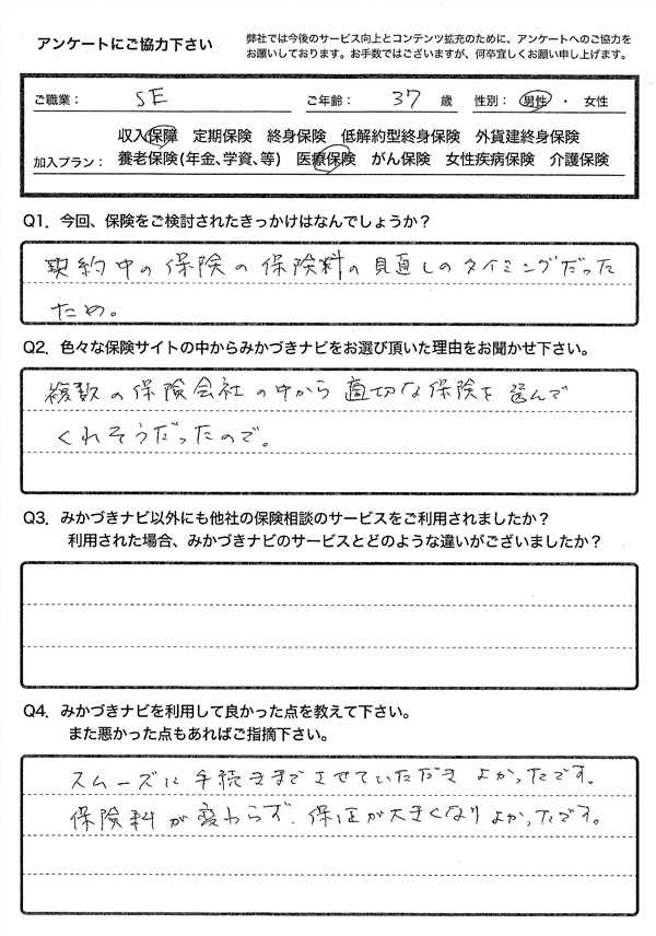 既に加入していた保険が更新タイプで、更新のタイミングで見直しをしました。