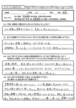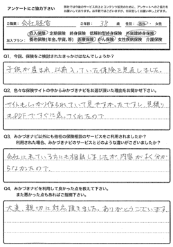 営業時間を遅くまでされているので、メール等、連絡を気がねなくできた。平日の仕事が終わった後に気さくに話ができ、説明を受けることができた。保険の種類を決めるまで、自分で時間がかかりましたが、気長に話をききいれて頂き、「自分の求めている保険が何なのか!」を導いて頂いた点、感謝しております。